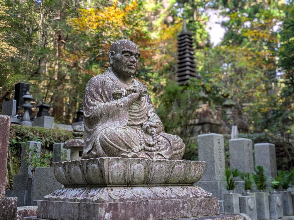 Our first full day in Osaka saw us not in Osaka. We left on an early train, travelled south for an hour, picked up a funicular railway followed by a dramatic bus ride up the side of a mountain to the hilltop town of Koyasan. It's not actually on a hilltop, but in a valley about 1000m up surrounded by eight peaks that tower another 1000m above the town - like a lotus plant apparently. That's according to the Buddhists who seem to run the place. It was first settled in the 9thC by the monk Kūkai and it is now consider the world headquarters of the Shingon sect of Buddhism. There's loads of information available for those interested. Suffice to say, for the heathens amongst us, there are over 200,000 shrines, temples and stone effigies dotted around the place. It is a rather dramatic and impressive place and well worth the trek to get there (and ours wasn't even a pilgrimage).
