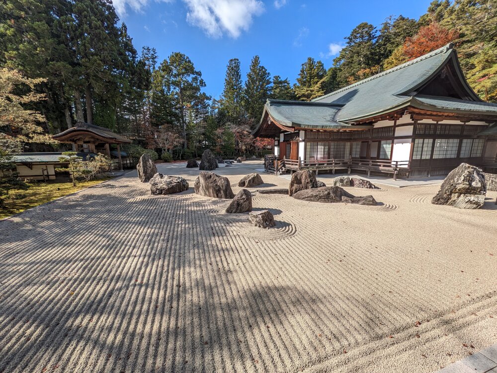 One of the temples at Koyasan contains Japan's largest rock garden - which is something to be seen. It is not as large as one might imagine, but it is quite impressive in its simplicity. It consists of gravel raked into patterns somewhat reminiscent of waves and dotted with boulders.