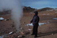 We came to an amazing red lake known as the Laguna Colorada. It changes hue and intensity during the day as the wind churns up the Dunaliella salina bacteria (so we're told). Here we saw even more of the rare Andean flamingos. Since we were travelling in tandem, we decided to push on to try and achieve our final objective of the Laguna Verde. As it turned out, the journey was not too bad, perhaps the wind had blown all the snow away. Eventually, we crested a ridge and spotted the incredible green lake with the Licancabur volcano as a backdrop. Quite a spectacular setting and (we felt) quite an achievement to get there.